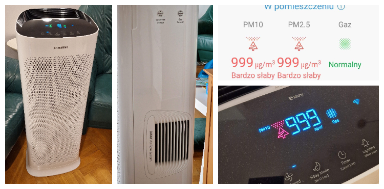 Zanieczyszczenia gazowe błyskawicznie wzrosły na „średnie”, ale poziom pyłu zawieszonego… no w szoku byłem. Wszystkie trzy kategorie przekroczyły 999 ug/m3, tylko dlatego, że wyświetlacz urządzenia mieści trzy cyfry. Biorąc pod uwagę jak długo zajęło niektórym z nich zejście na 998 stawiam, że poziom pyłów przekroczył 2000 ug/m3! Przy rozpędzonym „na maksa” oczyszczaczu doprowadzenie powietrza do porządku zajęło ok. półtorej godziny.