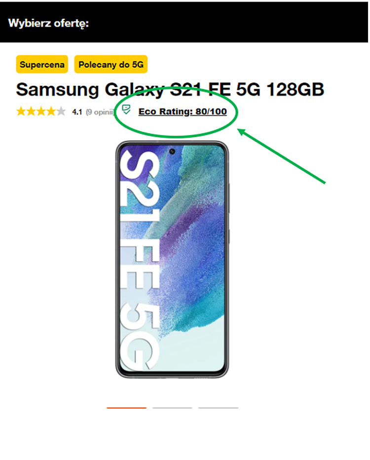 W e-sklepie Orange Polska część telefonów ma widoczny wskaźnik prezentujący jego ocenę. Po najechaniu na etykietę pojawia się szczegółowa informacja z danymi. Im wynik jest bliższy 100, tym wyższa efektywność środowiskowa urządzenia.