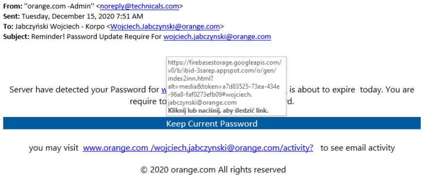 Wszystko ładnie wystylizowane, żadnych błędów stylistycznych (no, może ten „Password” z wielkiej mógłby dać co ostrożniejszym do myślenia). Tym niemniej żadnego bełkotu, bez przesady z użyciem nazwy/marki, całkiem sensowna treść. No i ta zachęta, że wystarczy tylko kliknąć, by zachować stare hasło!