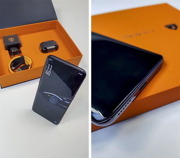 OPPO Find X Lamborghini jest dostępny w pięknym pudełku, a na zestaw składa się ładowarka i bezprzewodowe słuchawki – wszystko sygnowane logo Lamborghini.