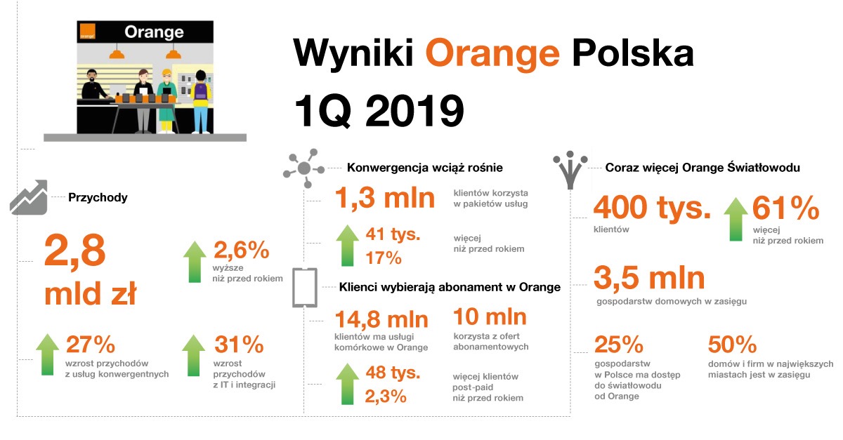 Pierwszy kwartał 2019 był udany pod względem komercyjnym. Liczba klientów internetu światłowodowego wzrosła o 61 proc. w porównaniu do 1 kwartału ubiegłego roku. W zasięgu Orange Światłowodu jest 3,5 mln gospodarstw domowych. W tym czasie wzrosła także baza użytkowników usług konwergentnych oraz usług mobilnych. Wpłynęło to na utrzymanie trendu wzrostu przychodów – były one o 2,6 proc. wyższe niż rok wcześniej.
