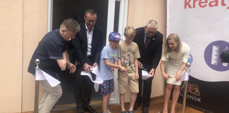 Zdjęcia z otwarcia FabLab Gdańsk powered by Orange. Na zdjęciu, od lewej Cyryl Sochacki członek zarządu Stowarzyszenia FabLab Gdańsk, Jean-François Fallacher, prezes Orange Polska, Piotr Kowalczuk, zastępca Prezydenta Gdańska ds. edukacji i usług społecznych oraz Ewa Krupa, prezes Fundacji Orange. W środku uczestnicy projektu Młodzi Technicy.