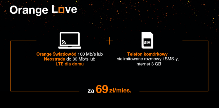 Klienci mogą skorzystać także z pakietu Orange Love składającego się 2 usług (Internet domowy w wybranej technologii i prędkości – Orange Światłowód, Neostrada lub Internet 4G dla domu – oraz Telefon komórkowy).
