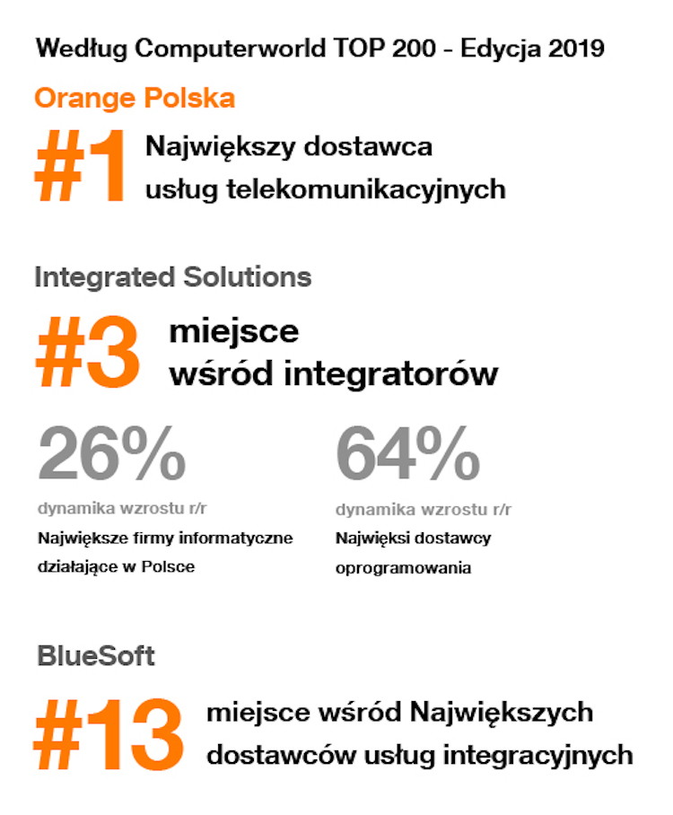 Ranking potwierdza także wysoką pozycję firmy BlueSoft, która dokładnie rok temu dołączyła do grupy Orange i zajmuje obecnie dziesiąte miejsce wśród dostawców usług integracyjnych w Polsce. Spółka ta wykazuje także imponującą dynamikę wzrostu w poszczególnych sektorach rynku.