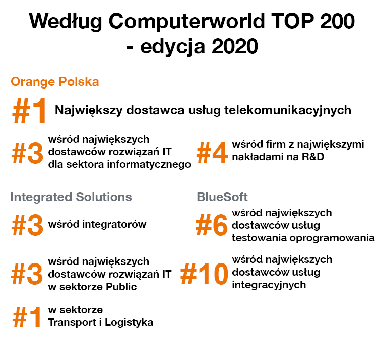 Orange Polska, podobnie jak w ubiegłym roku, jest największym na naszym rynku dostawcą usług telekomunikacyjnych, znacznie wyprzedzając kolejne spółki w zestawieniu. Integrated Solutions, integrator technologii Grupy jest w pierwszej trójce największych polskich integratorów. Jego rola jest szczególnie duża w dostarczaniu rozwiązań i usług IT dla branży transportowej, logistycznej, edukacyjnej, bankowej, także dla instytucji publicznych  i wielu innych dziedzin gospodarki. Od niedawna częścią grupy jest także firma BlueSoft, o czym pisaliśmy wcześniej w jednym z komunikatów prasowych. Zajęła ona wysoką pozycję wśród dostawców usług integracyjnych, z bardzo mocną dynamiką wzrostu – 198% rok do roku, w rankingu największych dostawców usług IT.