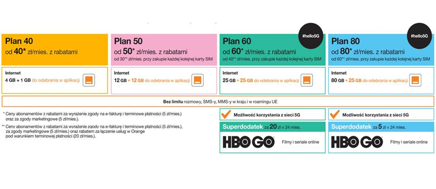Taryfy – funkcjonujące jako Plany Mobilne, czyli pakiety z rozmowami, smsami i internetem – zmienią nazwę na Abonament komórkowy. Nadal dostępne będą w 4 planach, jednak bardziej rozbudowanych, z większą ilością internetu i dodatkowymi benefitami – za 40, 50, 60, 80 złotych (pakiety i ceny w Orange Love nie zmienią się). Będą one umożliwiały korzystanie z #hello5G i wypróbowanie rozrywki w nowej jakości. A sprzęty, obsługujące tę sieć, będzie można kupić w specjalnych cenach w promocji Ale okazja!.