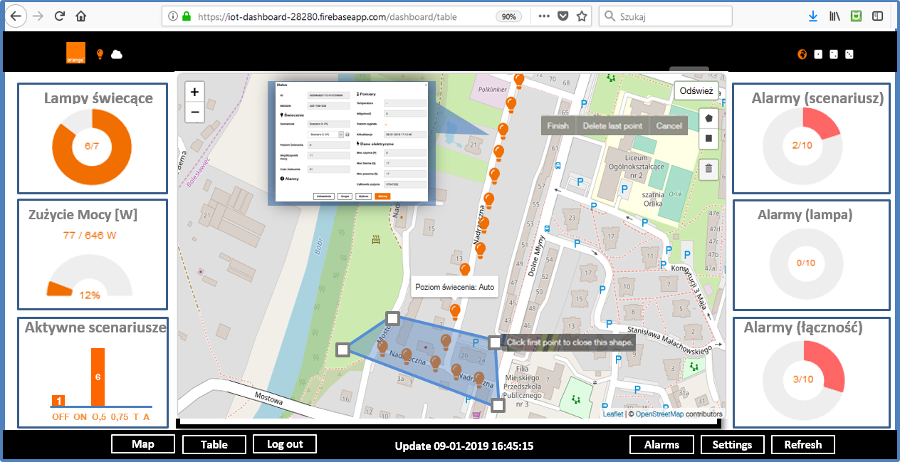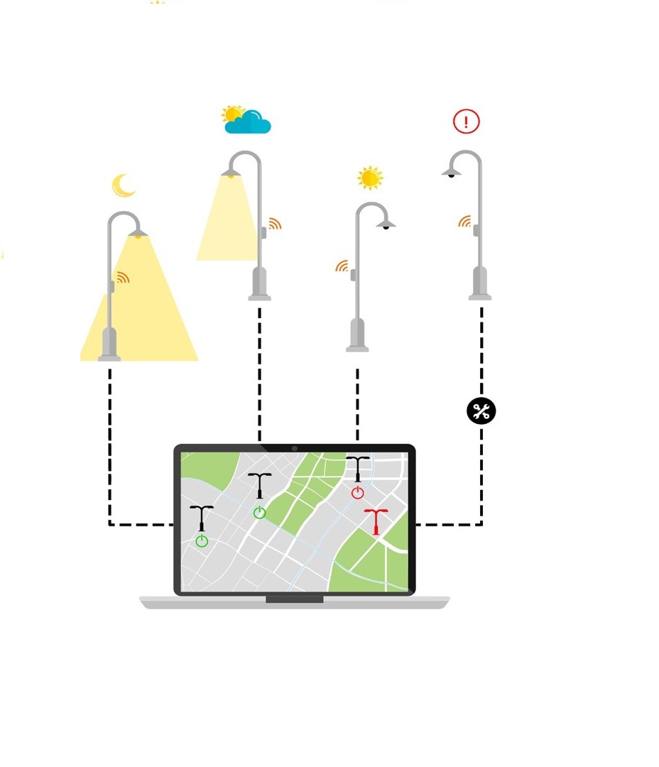 Zarządzanie całym systemem odbywa się w prosty i intuicyjny sposób w ramach naszej Platformy Zarządzania Miastem. Można sterować oświetleniem z każdego miejsca z dostępem do internetu. Dwukierunkowa komunikacja pomiędzy oprawą LED a systemem sterowania odbywa się w oparciu o sieć transmisji danych działającą w paśmie licencjonowanym LTE-M. Sieć zapewnia bezpieczeństwo całego systemu, stabilny sygnał i gwarancję wieloletniego działania.