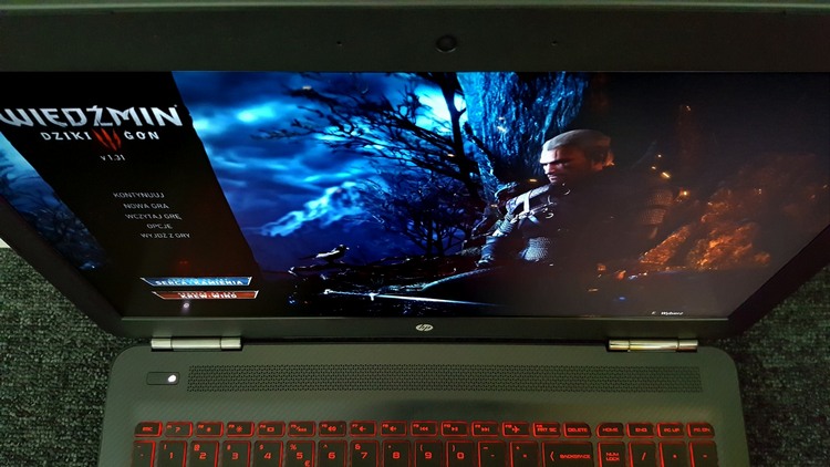 Sam ekran zamocowany jest na solidnych zawiasach – 15,6 calowa matryca Full HD (1920×1080), jest matowa i ma sporą tolerancję kątów patrzenia – zarówno na boki jak w płaszczyźnie pionowej, to oczywiście dobrze i źle, bo choć obraz jest bardzo dobry, to żona z daleka może zobaczyć, że wcale ciężko nie pracuję tylko „znów gram” 😉 No trudno – coś za coś. Matryca mi się bardzo podoba, nie odbija obcych źródeł światła i nie męczy wzroku – nigdy więcej nie kupię błyszczącej. Całość zamknięta jest w stosunkowo cienkiej obudowie przywodzącej na myśl ultrabooki, także jeśli chodzi o wagę (zaledwie nieco ponad 2 kg). Oczywiście ceną za to jest pewna wiotkość pokrywy ekranu, która wygina się lekko przy podnoszeniu z jednej strony, a zamknięta ugina się pod naciskiem z zewnątrz – mimo, że faktura tworzywa z jakiego została wykonana udaje włókno węglowe. Cóż… niestety za włókno węglowe w pokrywie laptopa trzeba byłoby zapłacić o wiele więcej, a Omen jest urządzeniem, które można zaliczyć do kategorii budżetowych, choć w jego przypadku to akurat zaleta a nie przytyk.
