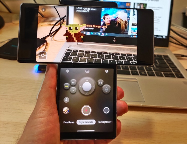 W trybie gimbala mamy możliwości ustawienia opcji: „Pierwszy plan”, „Śledzenie panoramiczne” oraz „Obserwowane” a także blokady na obiekt. I pewność, że nie zrobimy przypadkiem pionowego wideo, którego nie da się oglądać 😉 Warto jednak zapamiętać, że z rozłożonym telefonem uruchomiwszy kamerę nie zrobimy… zdjęcia. Rozłożony telefon + włączona aplikacja aparatu = jedynie możliwość kręcenia filmów.
