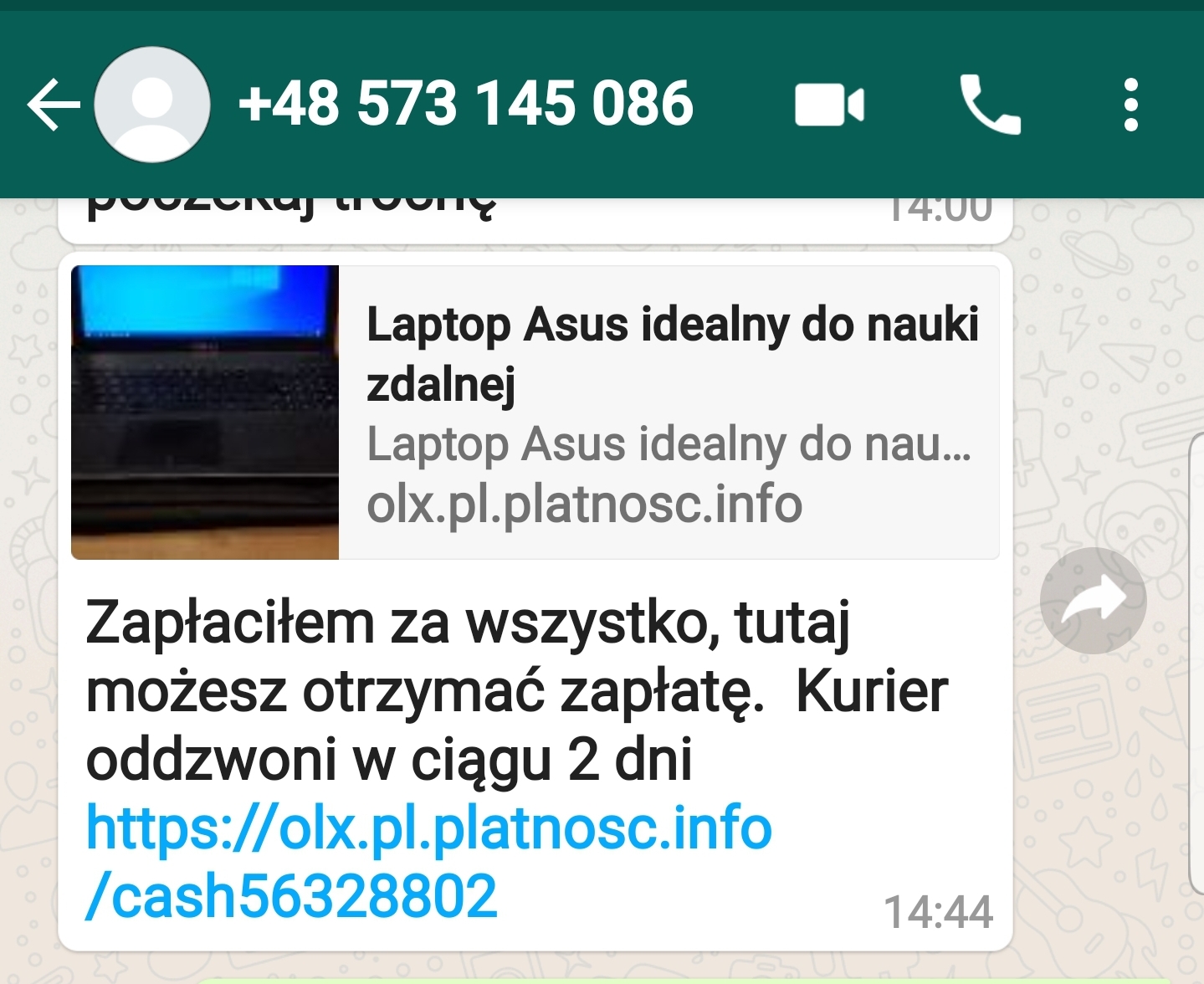 Linki z rzekomo dokonanymi transakcjami są finalną częścią rozmów z ofiarą za pośrednictwem zewnętrznego komunikatora. A nad WhatsAppem, wykorzystywanym w polskich kampaniach, firmy pośredniczące w sprzedaży nie mają kontroli, nie mogą np. monitorować podejrzanych linków.