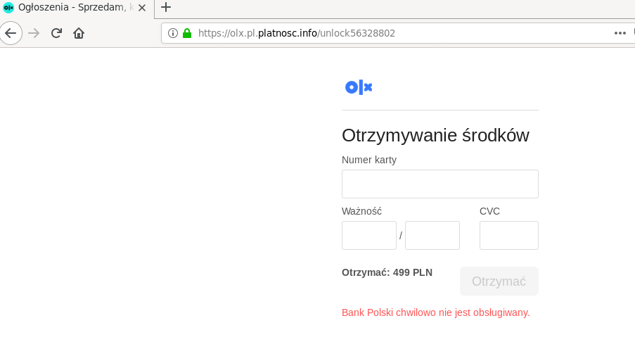 Oczywiście jeśli już wpiszemy dane, nikt nam nie napisze: „Dzięki, właśnie dałeś się okraść!”. W zamian za to zobaczymy, że coś jest nie tak (cóż za zaskoczenie…).