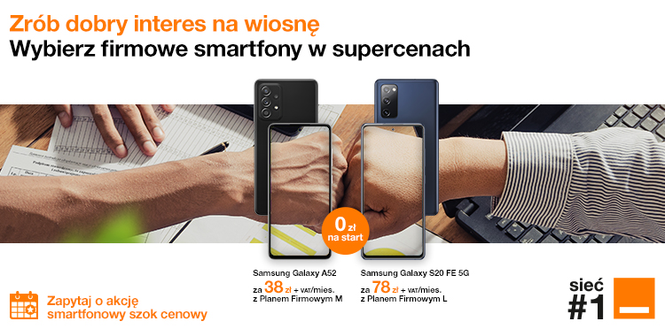 Orange rozpoczyna też kolejną odsłonę promocji „Smartfonowy szok cenowy”, w ramach której klienci biznesowi otrzymają telefony w bardzo atrakcyjnych cenach. Do wyboru: realme C11 2/32 GB w Planie Firmowym S z ratą miesięczną 12 zł + VAT, Xiaomi Redmi Note 8 2021 4/64 GB przy zakupie Planu Firmowego S z ratą 22 zł miesięcznie + VAT, Xiaomi 11 Lite 5G NE 8/128 GB oraz vivo V21 8/128GB 5G przy podpisaniu umowy na Plan Firmowy M – rata 48 zł + VAT, OPPO Reno6 5G 8/128GB z Planem Firmowym L i ratą miesięczną 64 zł + VAT, a także Xiaomi 11T Pro 5G 8/256 GB w Planie Firmowym XL z miesięczną ratą miesięczną 82 zł +VAT.