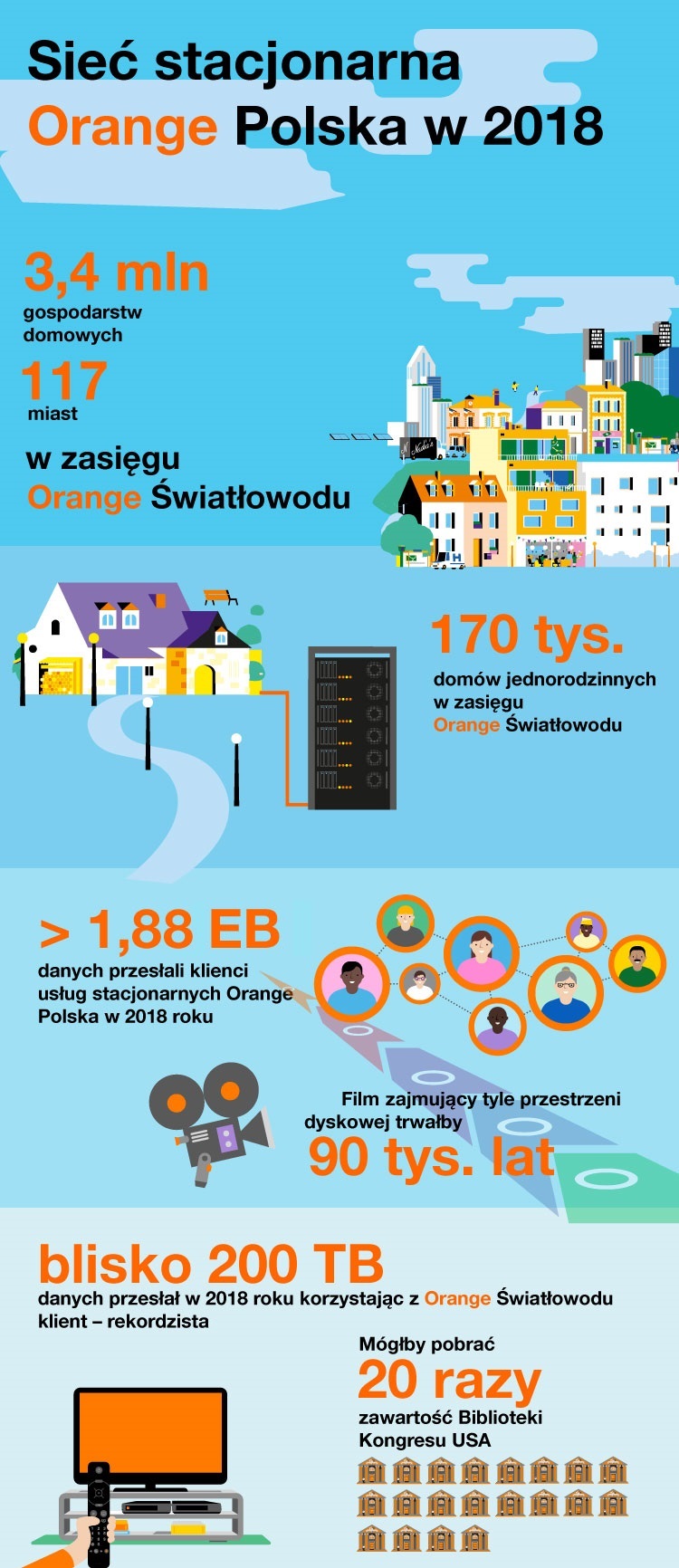 Podobnie jak klienci korzystający z naszej sieci mobilnej, klienci usług stacjonarnych także przesyłają z roku na rok więcej danych – w 2018 transfer wzrósł o 20%, a w sumie przesłaliście ponad 1,88 EB, czyli eksabajtów. Tyle miejsca na dysku zajmują dla przykładu trwające 90 tys. lat pliki wideo. Dla przypomnienia – mniej więcej 90 tys. lat temu pierwsi Homo Sapiens wyszli z Afryki, więc to bardzo, bardzo dużo czasu. 1,88 EB danych to także równowartość ponad 430 mln płyt DVD o standardowej pojemności 4,7 GB. Jedna płyta ma tylko 1,2 milimetra grubości, ale gdyby ułożyć je jedna na drugiej wieża zbudowana w ten sposób miałaby ponad 500 km wysokości i sięgałaby 100 km ponad orbitę Międzynarodowej Stacji Kosmicznej.