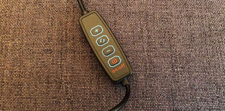 Jeśli chcemy skorzystać z oświetlenia LED, musimy podłączyć zestaw do źródła zasilania kablem USB – np. do komputera lub kostki ładującej naszego smartfona. Za pomocą pilota na kablu ustawimy intensywność oświetlenia, a także temperaturę barwową, do wyboru: ciepłą, zimną i neutralną. Lampa ma średnicę 26 cm i jest naprawdę skuteczna – ustawiona na maksymalną jasność, świeci bardzo intensywnie. Nawet w bardzo zaciemnionym pomieszczeniu nasza twarz będzie dobrze widoczna.