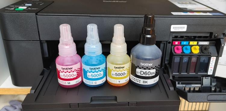 Pomysł drukarki z widocznymi zbiornikami tuszu od początku mnie zaintrygował. Genialny w swojej prostocie. Koniec niespodzianek, kiedy nagle z dnia na dzień trzeba będzie szukać tuszu w sieci, a tu czekają dokumenty do wydrukowania. Co więcej, dostarczane z drukarką tusze to po prostu małe buteleczki. Otwieramy je, wkładamy do oznaczonych odpowiednimi kolorami (ależ mnie kusiło, żeby się pomylić 😉 ) otworów i dajemy im się wlać. Nawet taka pierdoła jak ja nie zdołała się ubrudzić.