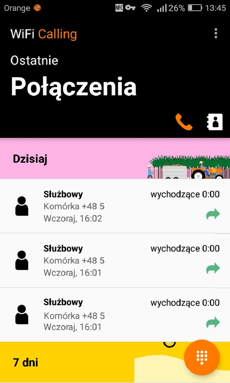 Testowałem aplikację już od jakiegoś czasu i mogę powiedzieć z czystym sumieniem, że działa świetnie. Warto przed wykonaniem połączenia sprawdzić, czy wspomniane ikonki telefonu i klucza są widoczne. Połączenie jest błyskawiczne, a rozmowa w najwyższym standardzie. Aplikacja jest dostępna dla większość urządzeń z Androidem – zadziała na wersji 5.0 lub wyższej. Hula w najlepsze także na urządzeniach bez naszego oprogramowania, pod warunkiem, że w środku znajduje się SIM Orange Polska. W przypadku telefonów Dual SIM, jako aktywny musi być ustalony SIM Orange. Jest jednak jedno, dość ciekawe ograniczenie – aplikacja nie zadziała na telefonach, które mają już WiFi Calling wgrany przez producenta lub przez nas – chodzi o modele Samsung S8, S7 i S6. Oczywiście w tej kategorii mieszczą się także iPhone’y, lecz one nie funkcjonują na Androidzie, tylko na iOS, więc tu temat rozwiązuje się sam. Gdy spróbujecie wgrać aplikację na wspomnianych wyżej Samsungach uda się to, lecz aplikacja nie będzie działać. Gdybyście chcieli zobaczyć jak wygląda aplikacja (choć lepiej ją po prostu pobrać), to zrzut ekranu znajdziecie pod tym linkiem (JPG, 123KB).